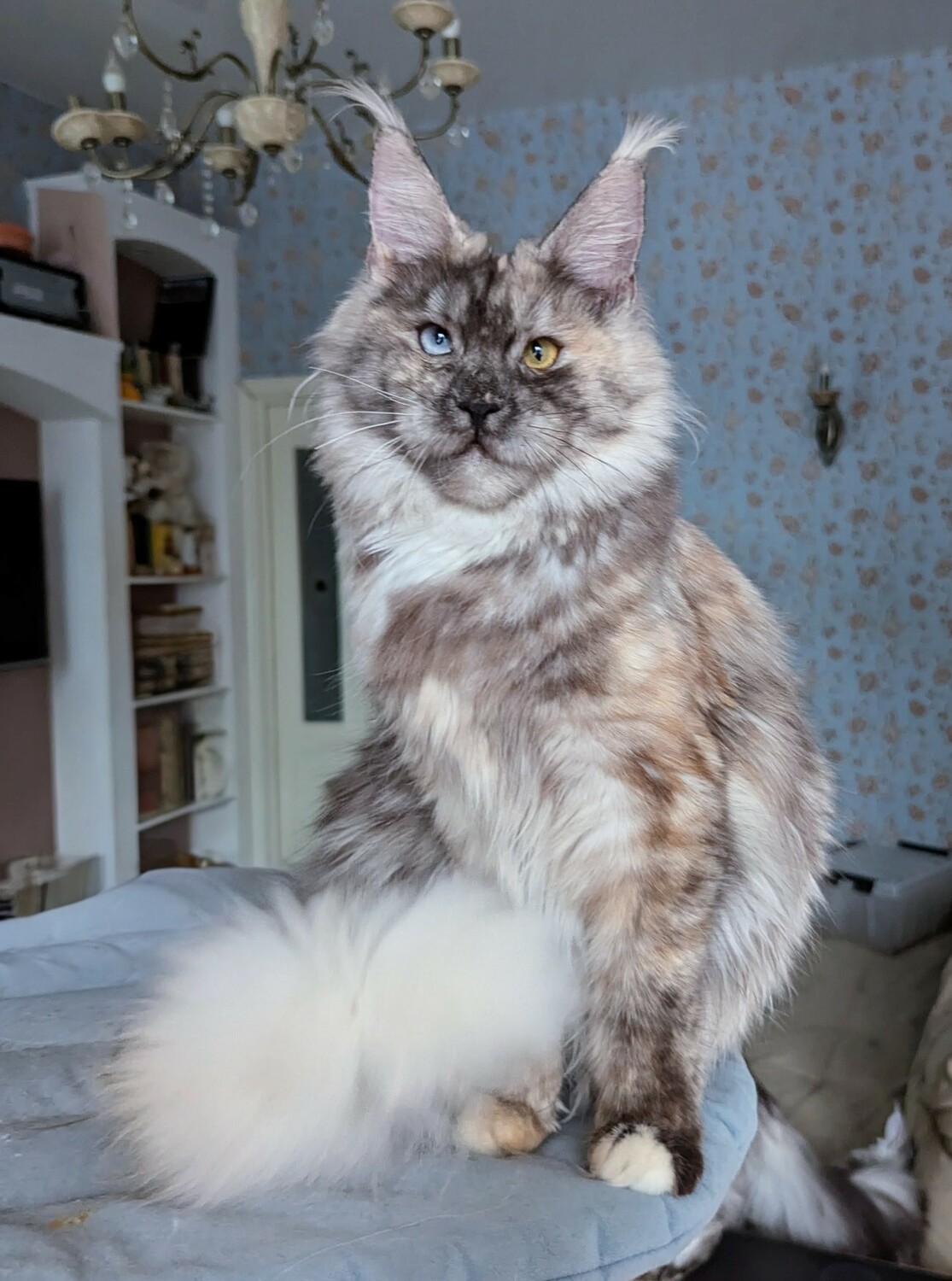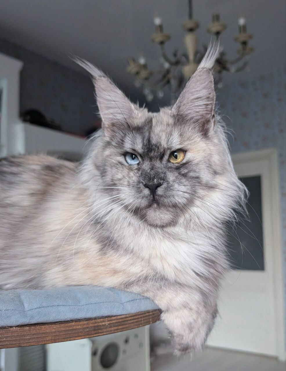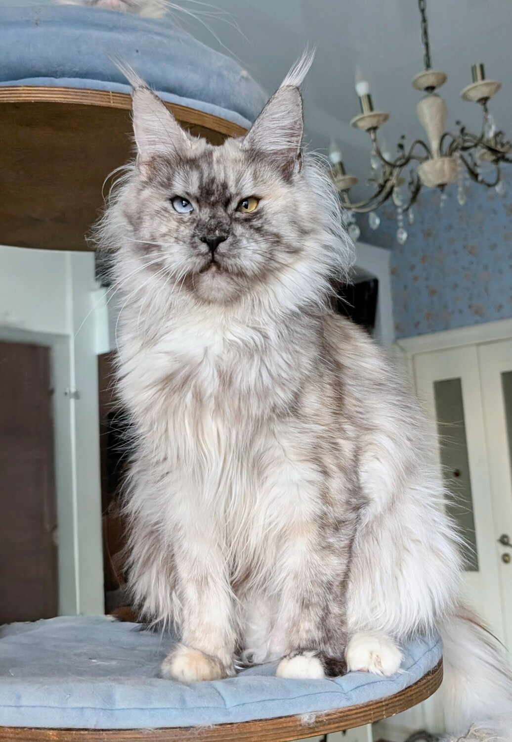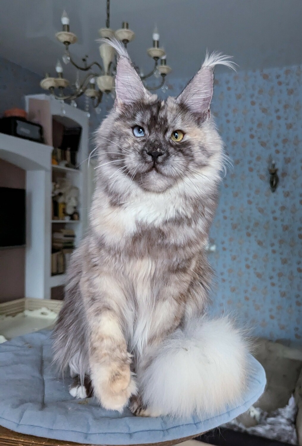 She has odd eyes, clear smoke color, a great muzzle and chin, a strong body structure, big ear tassels.