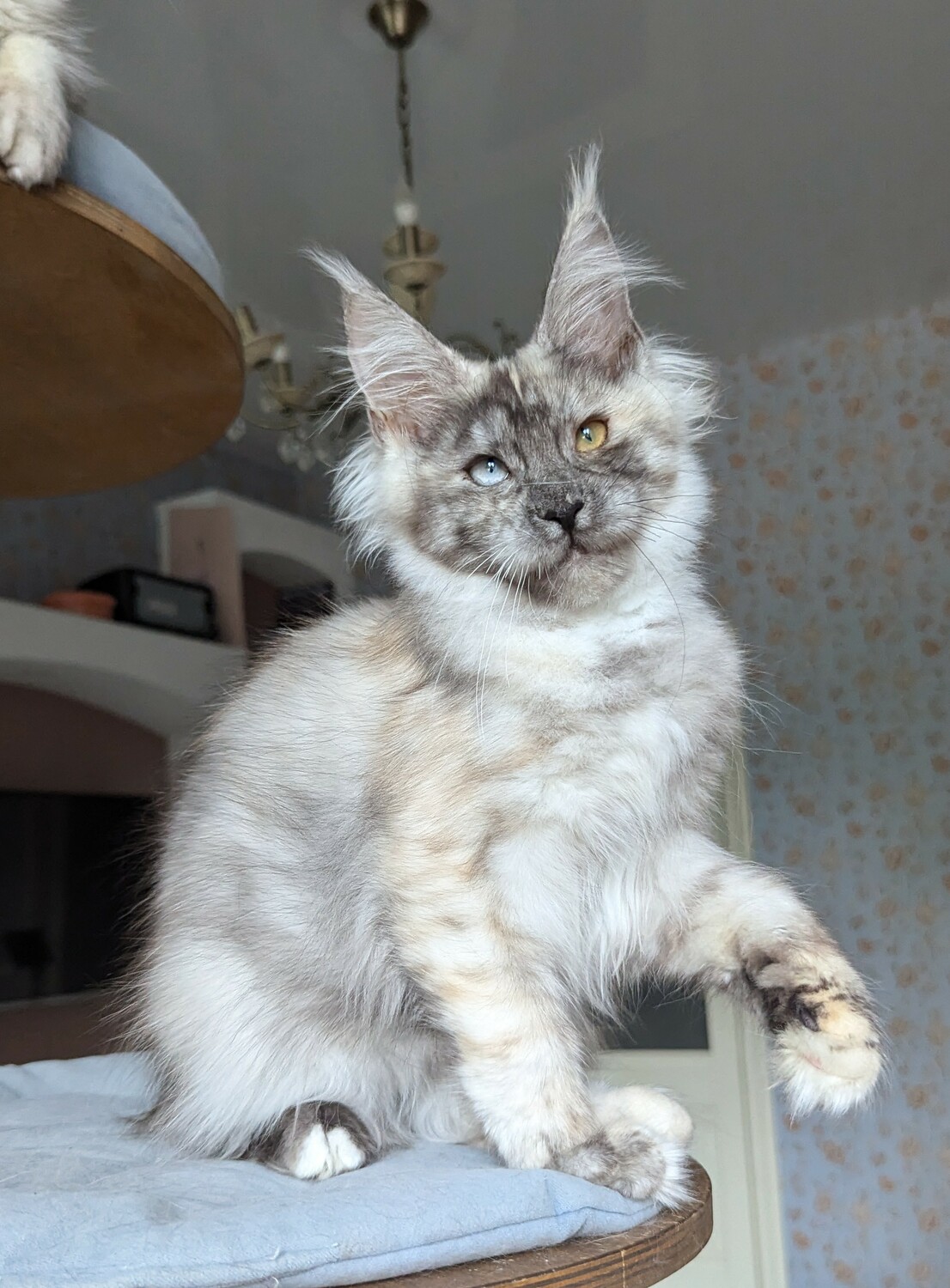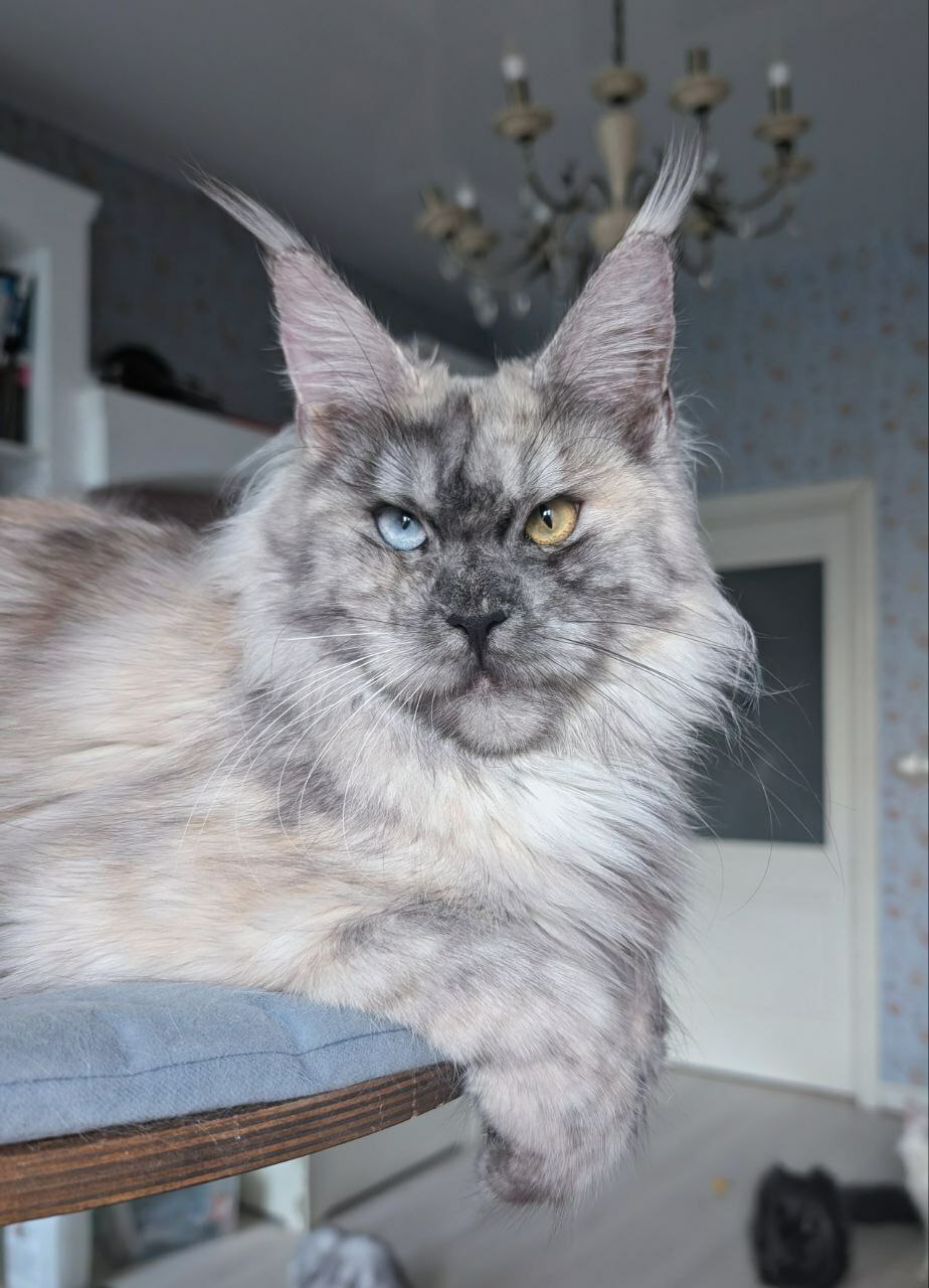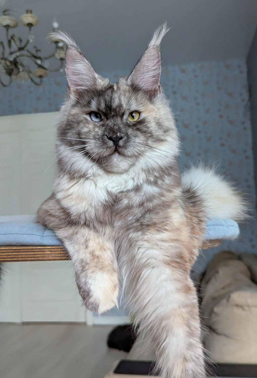 She has odd eyes, clear smoke color, a great muzzle and chin, a strong body structure, big ear tassels.