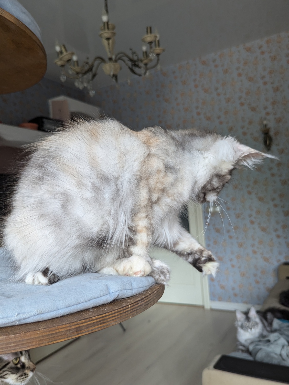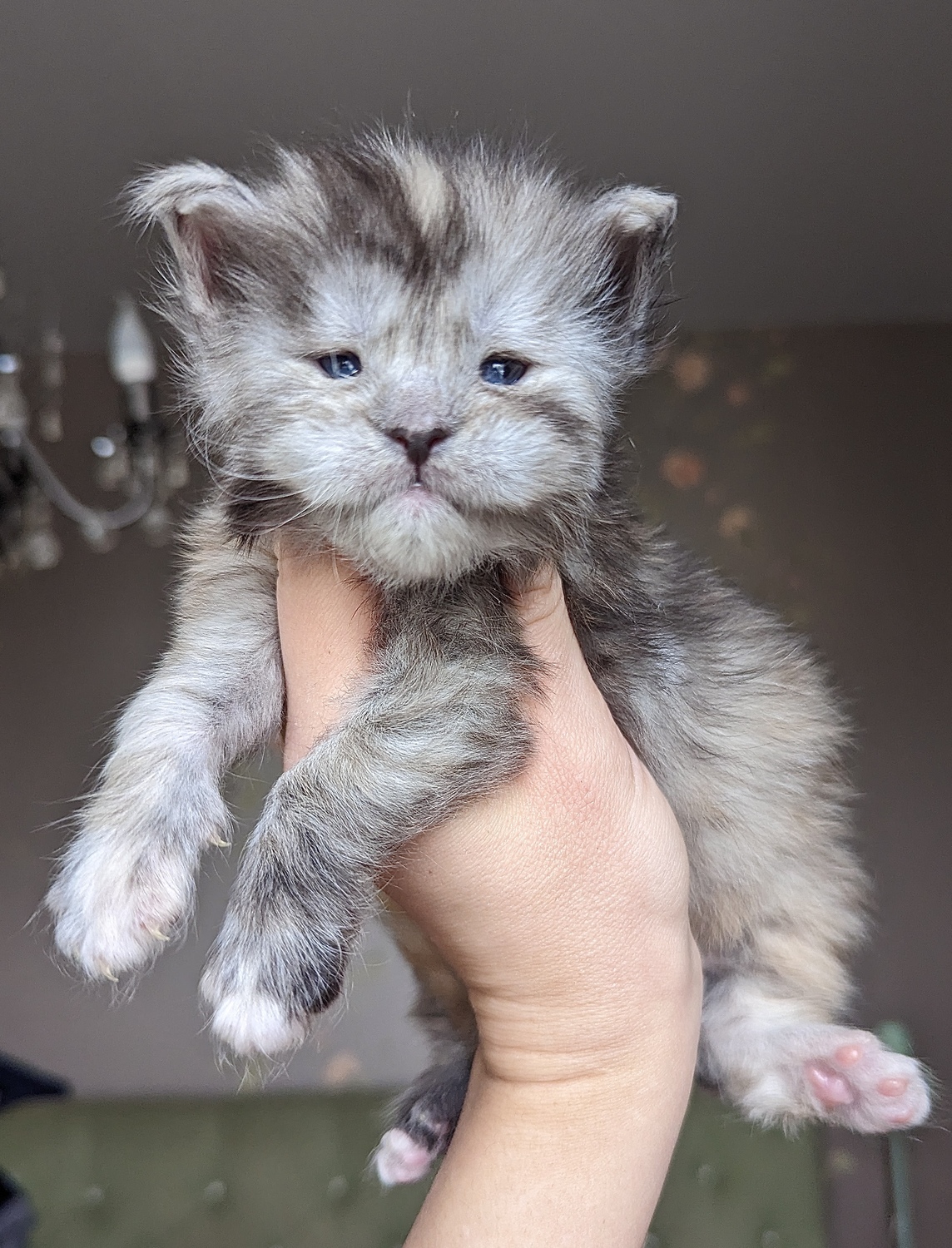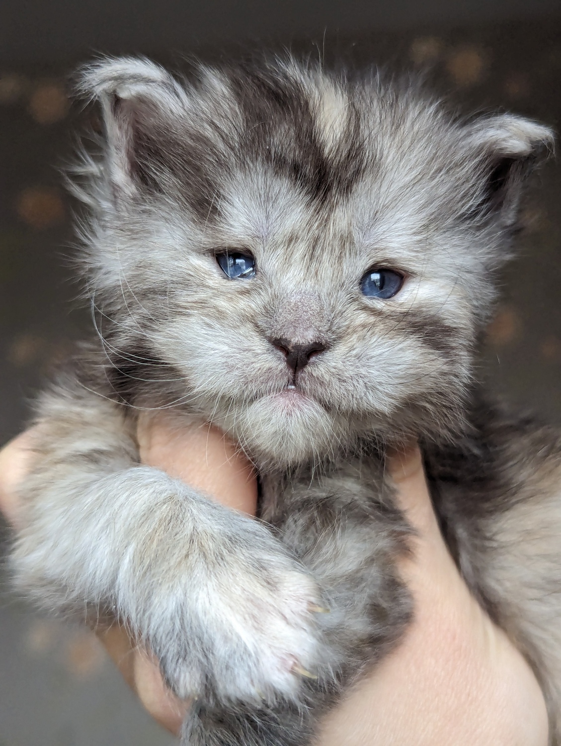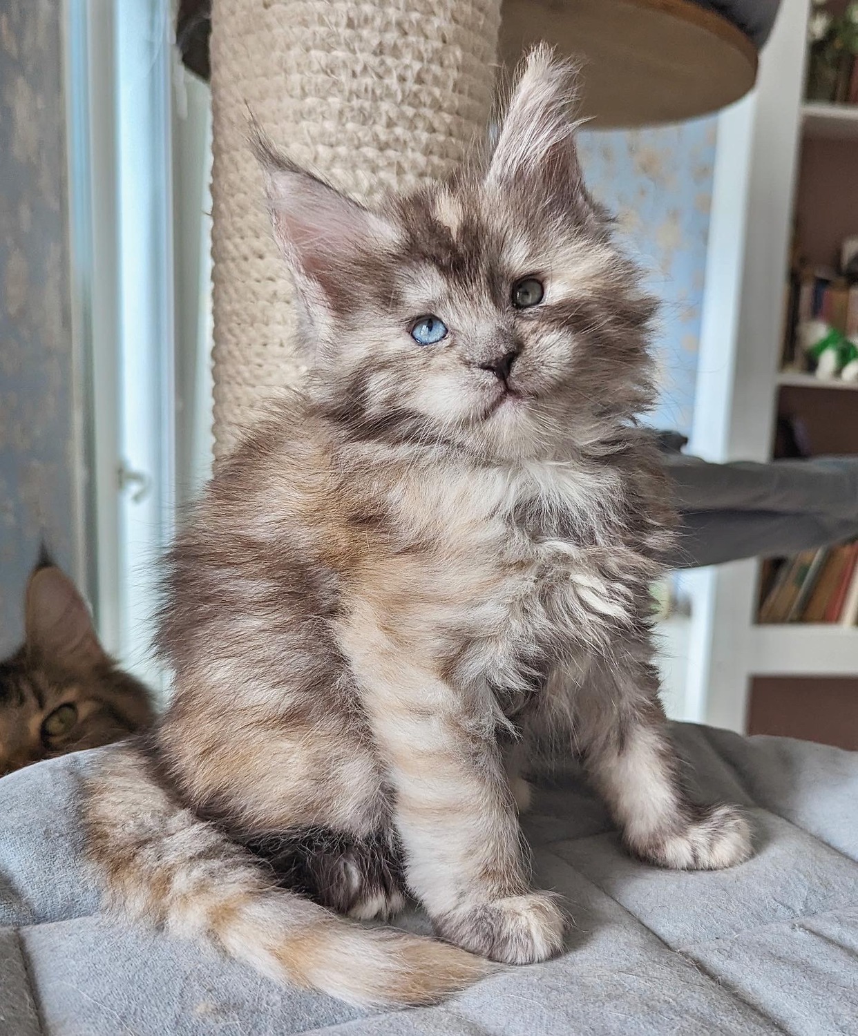 She has odd eyes, clear smoke color, a great muzzle and chin, a strong body structure, big ear tassels.