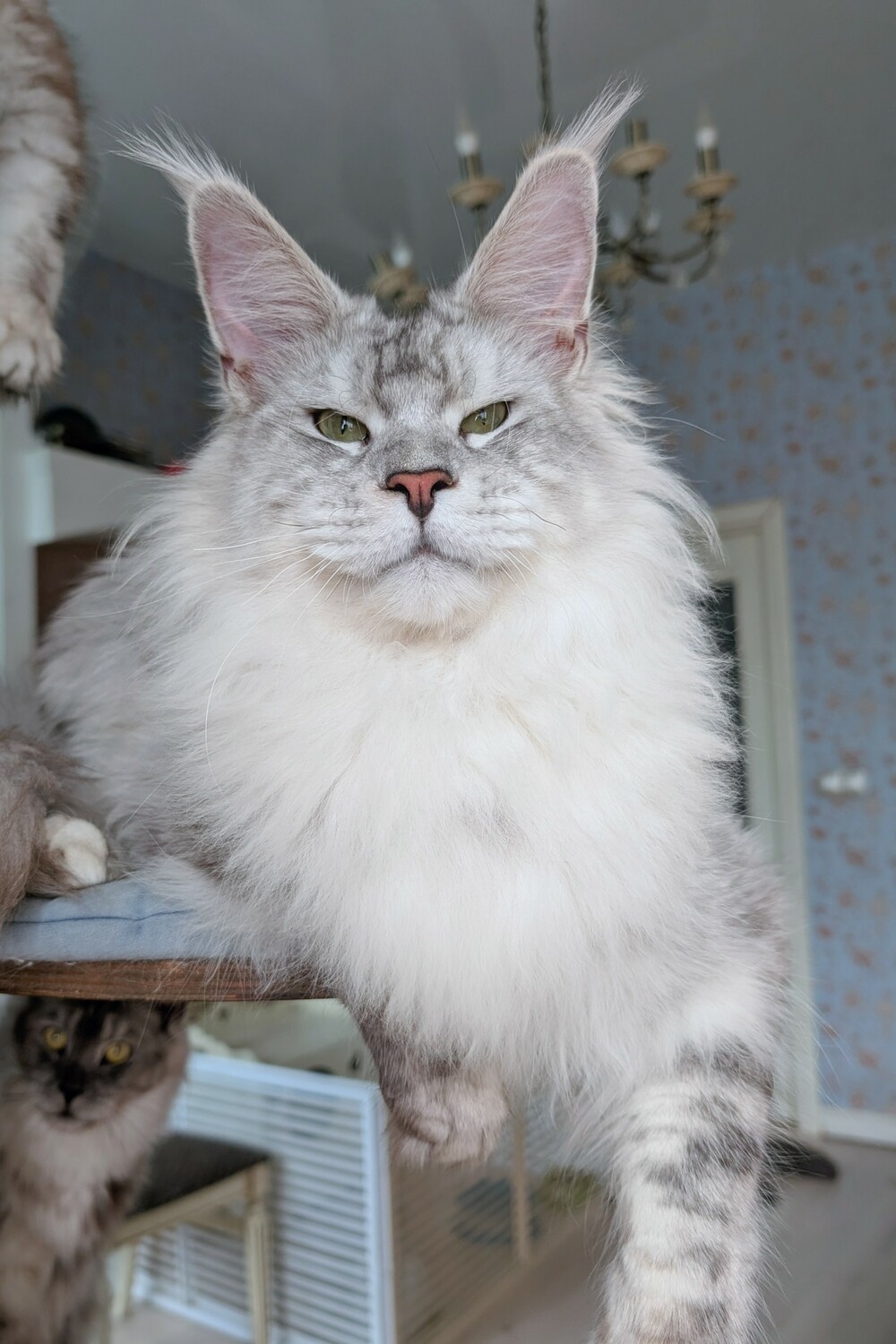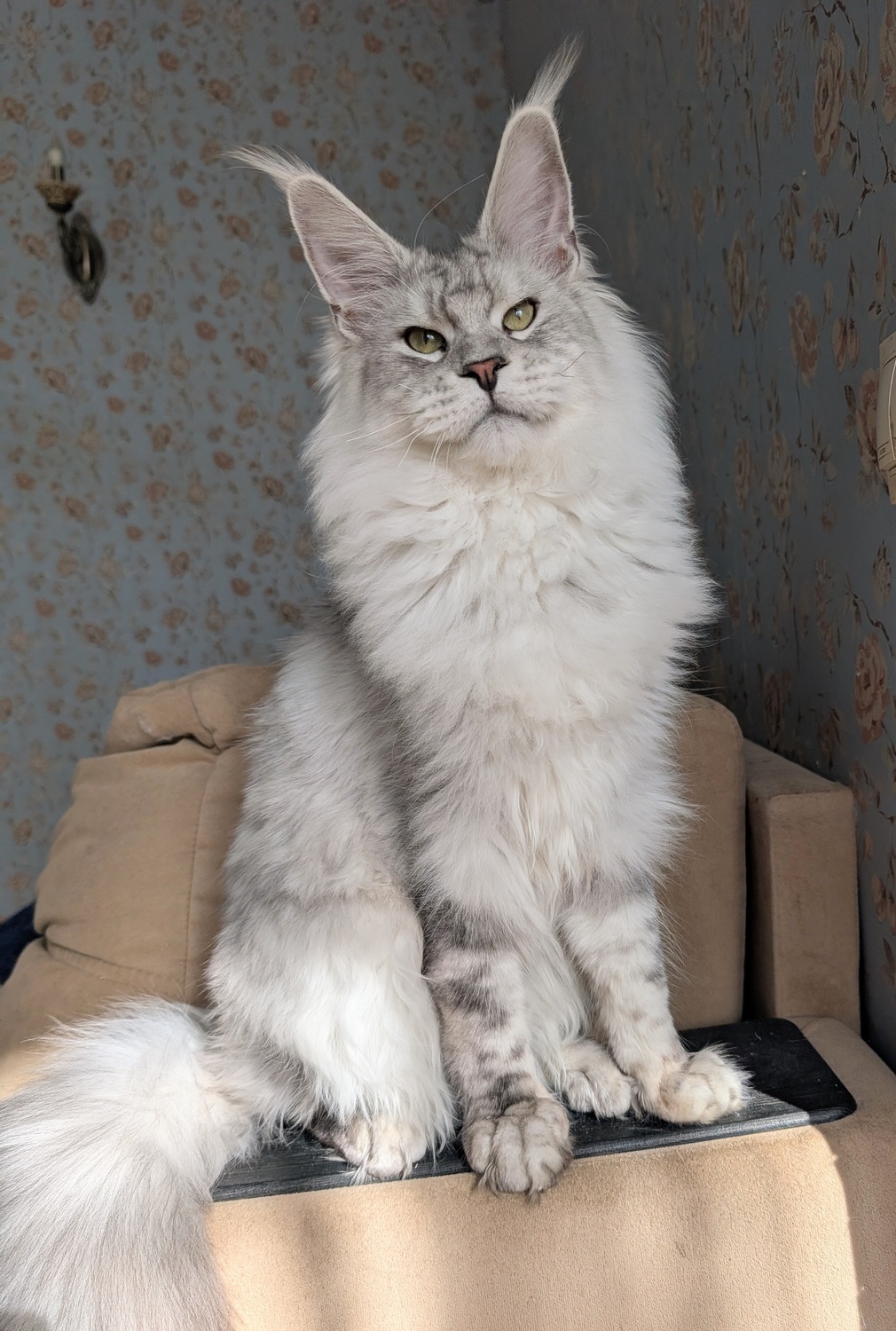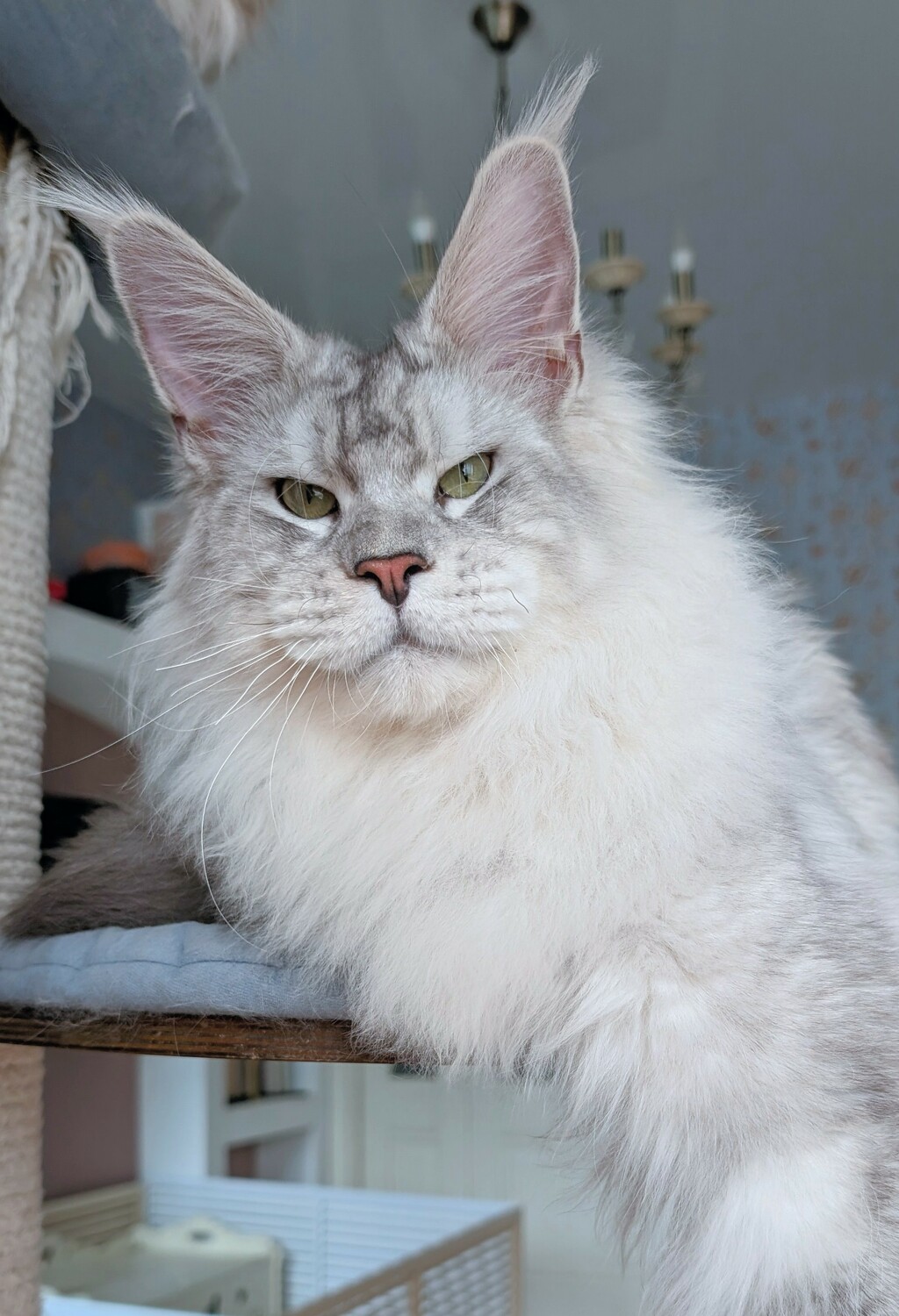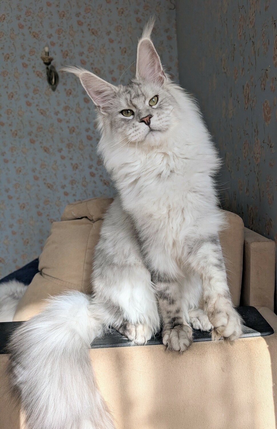 He has huge ears, a wide muzzle, a good profile and a very expressive look of the green eyes. He has a very good size, high on legs and with a long massive body with strong bones and excellent fur.