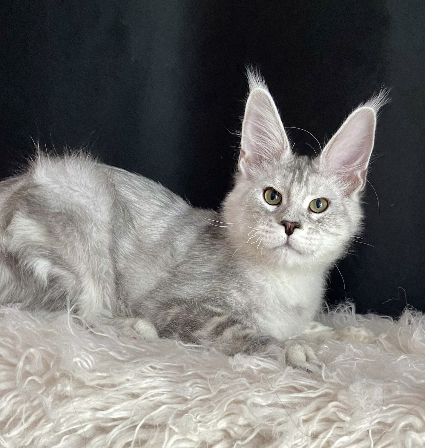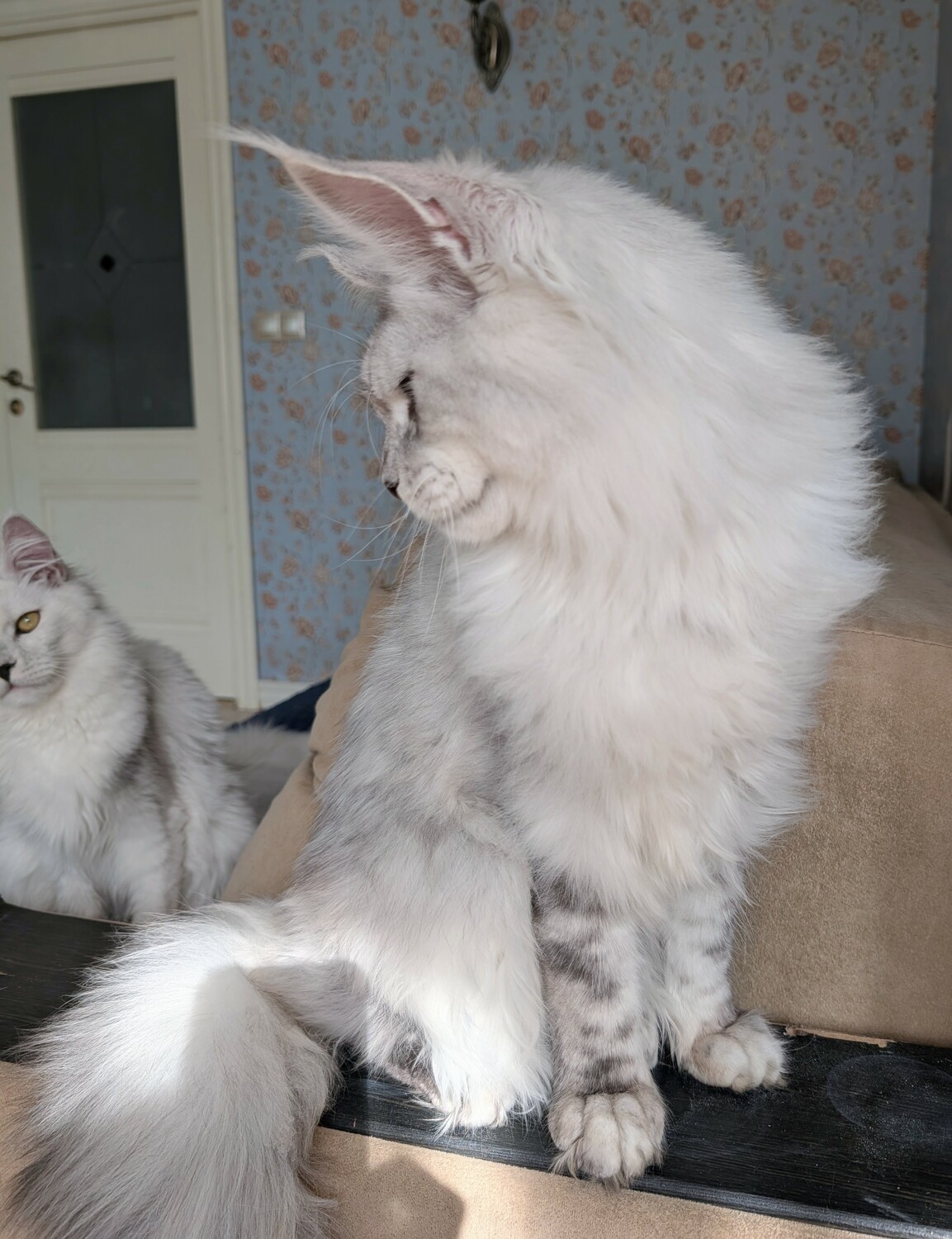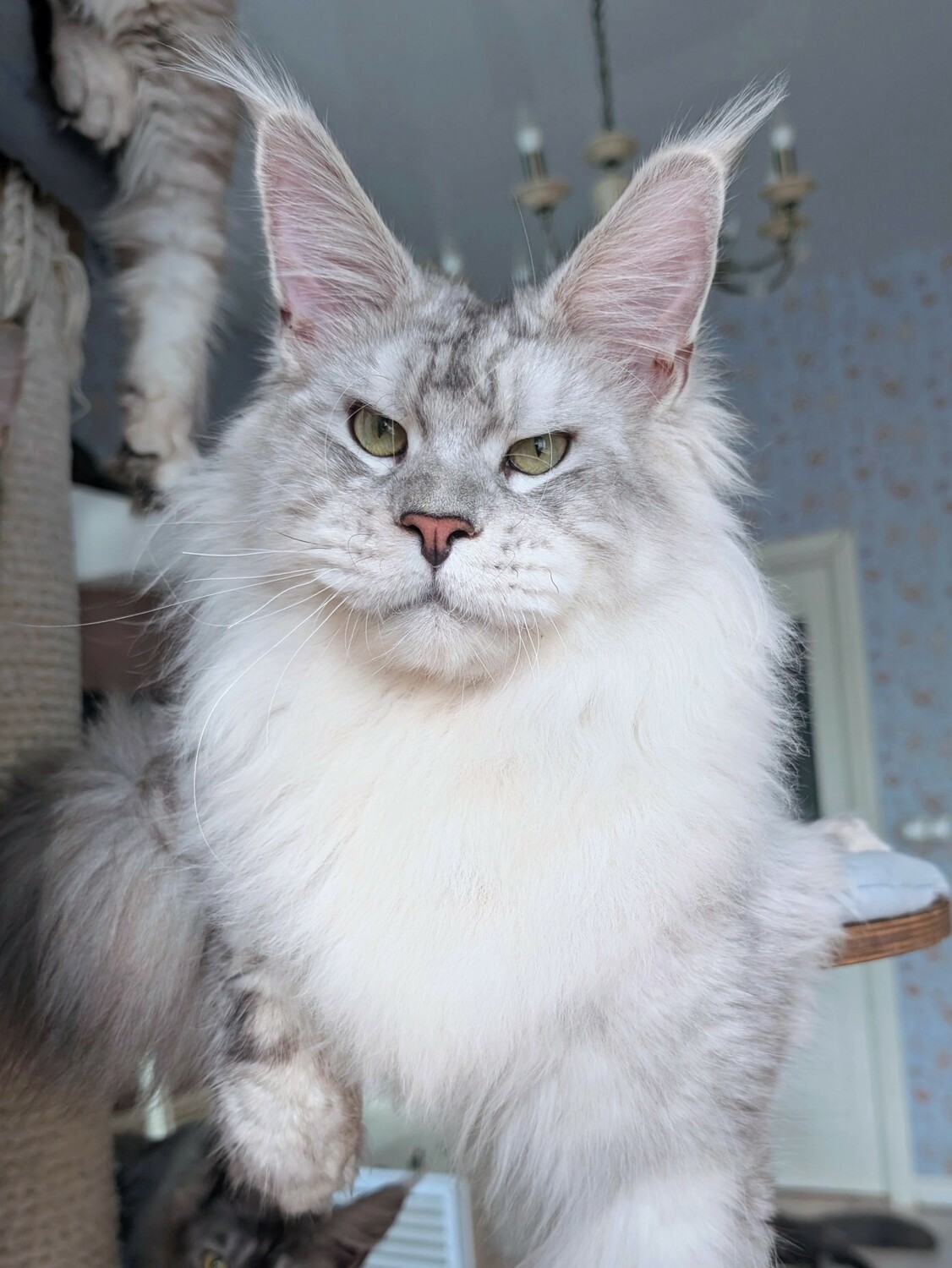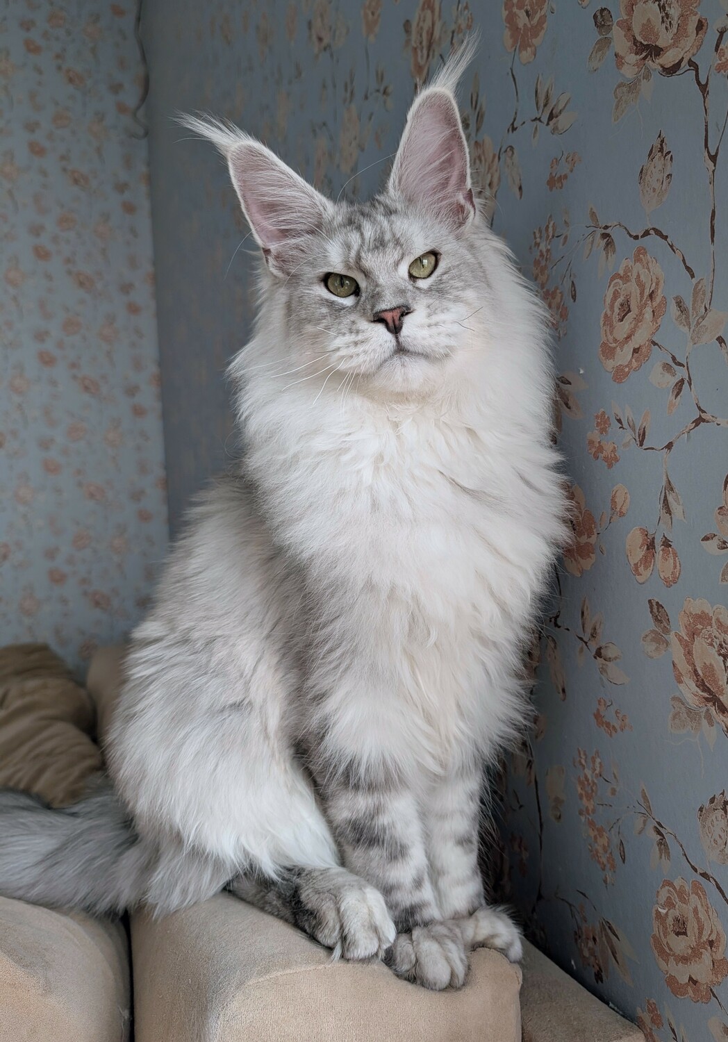 He has huge ears, a wide muzzle, a good profile and a very expressive look of the green eyes. He has a very good size, high on legs and with a long massive body with strong bones and excellent fur.