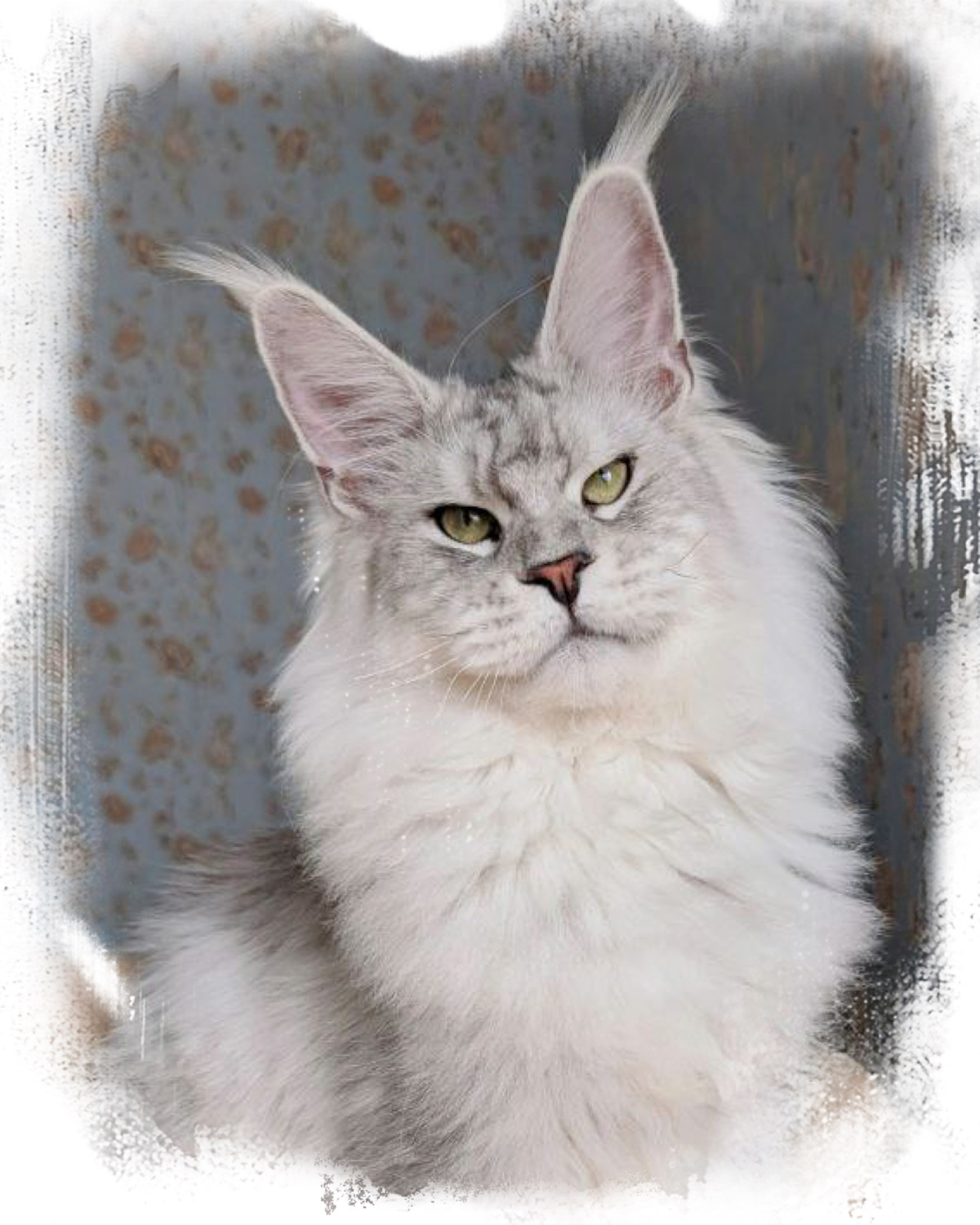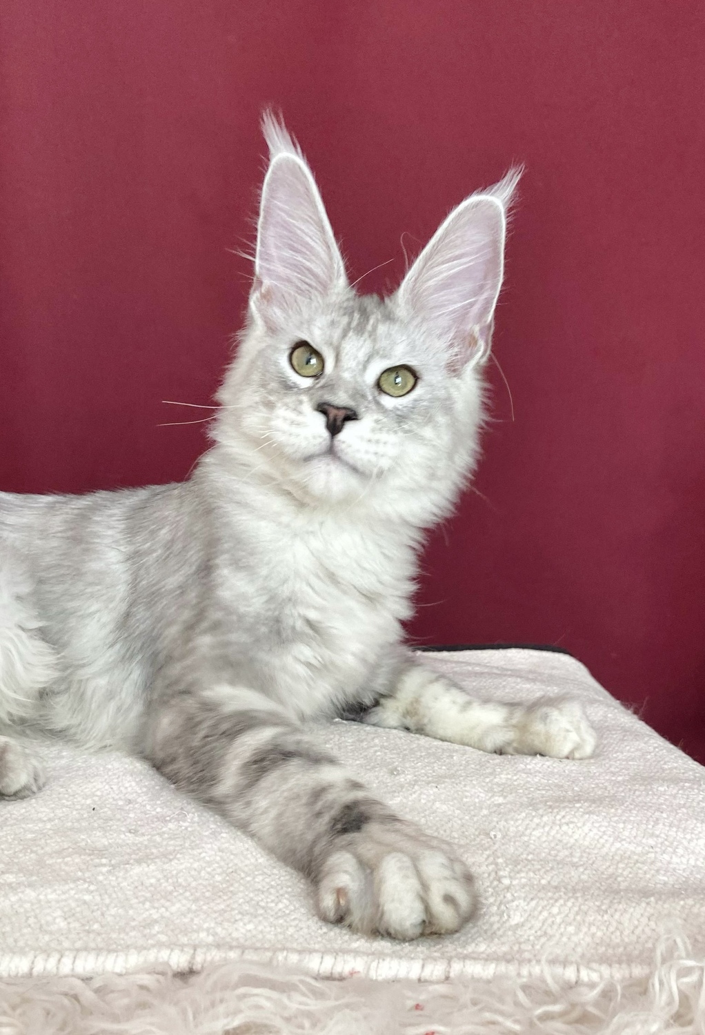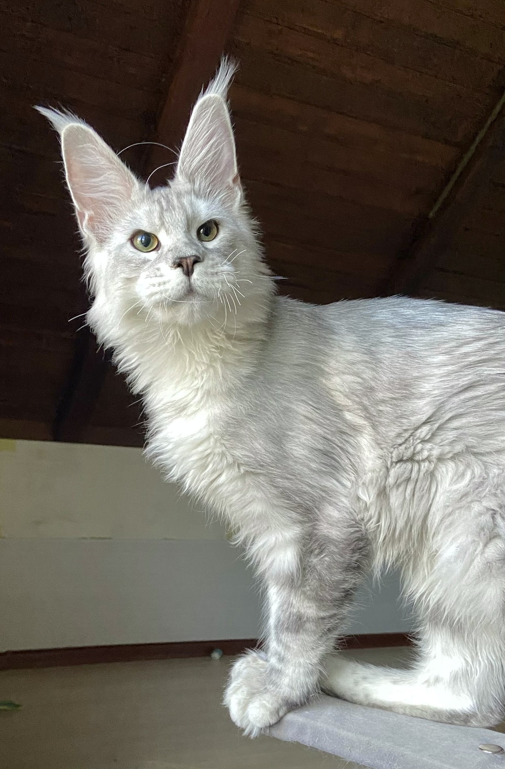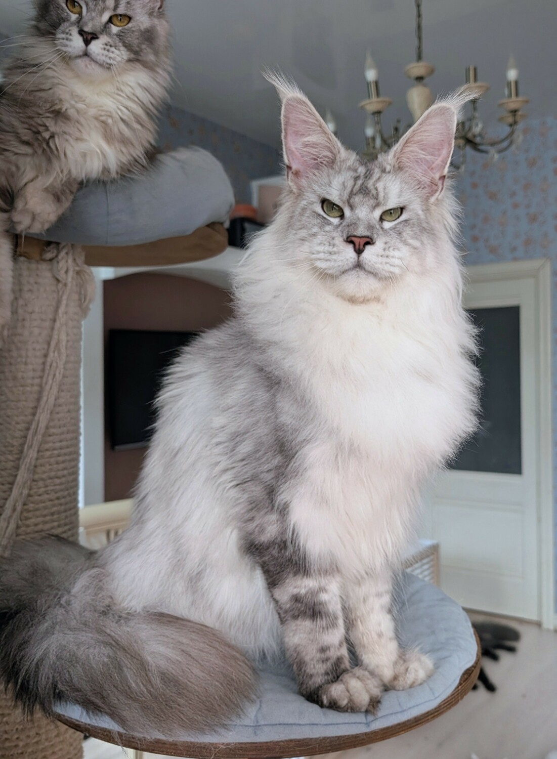 He has huge ears, a wide muzzle, a good profile and a very expressive look of the green eyes. He has a very good size, high on legs and with a long massive body with strong bones and excellent fur.