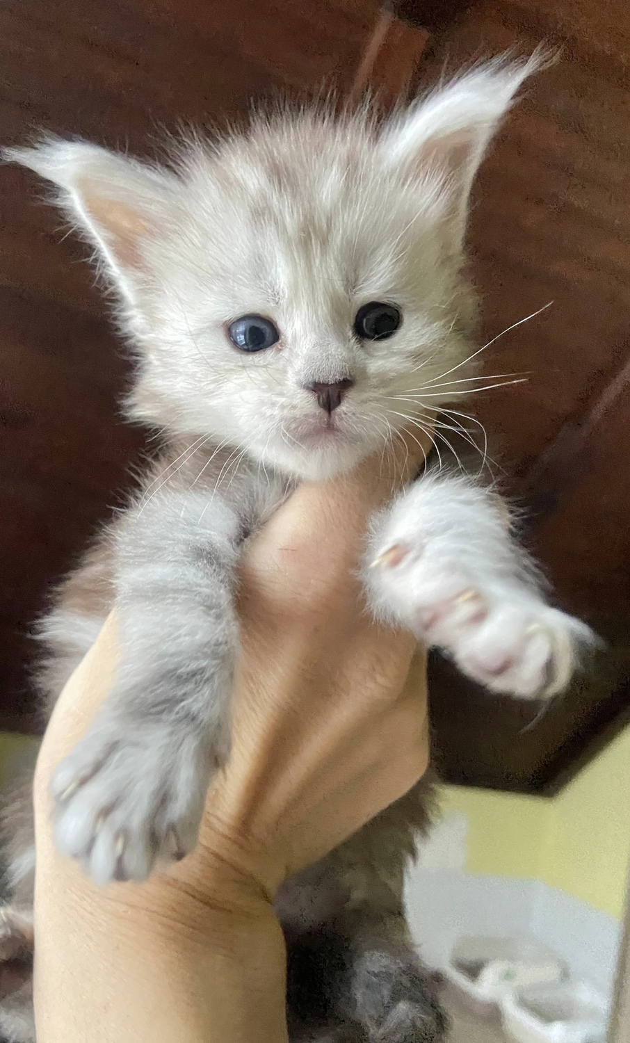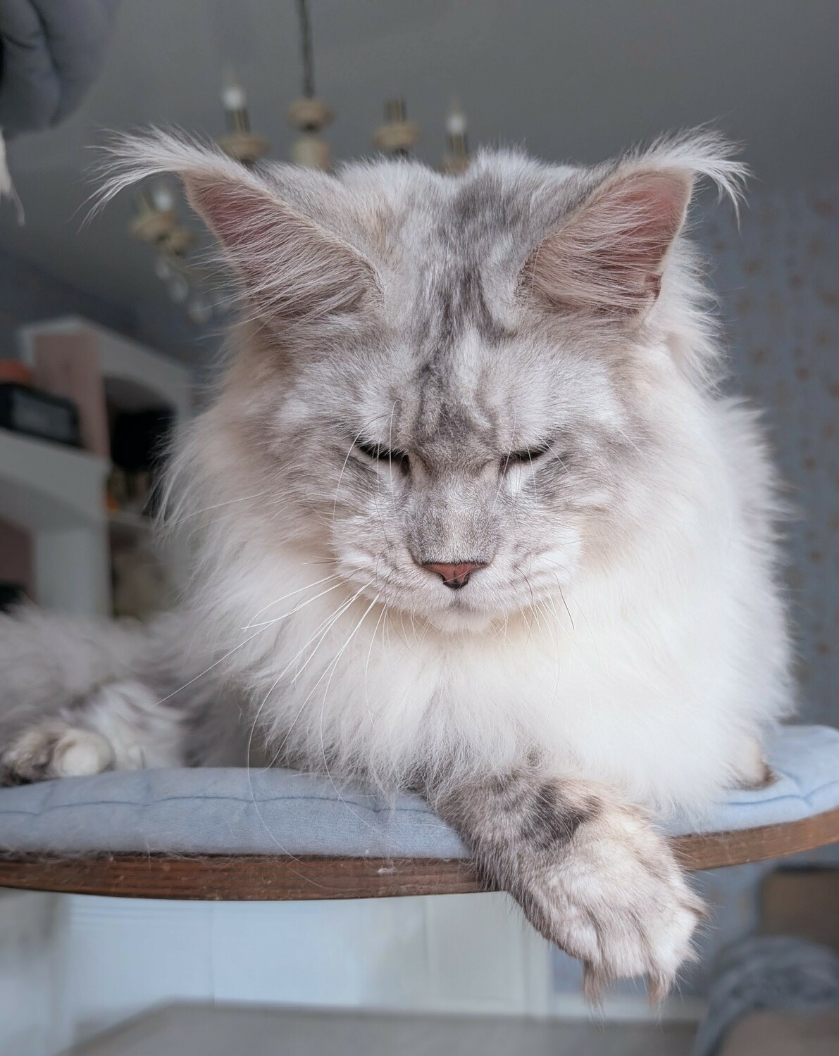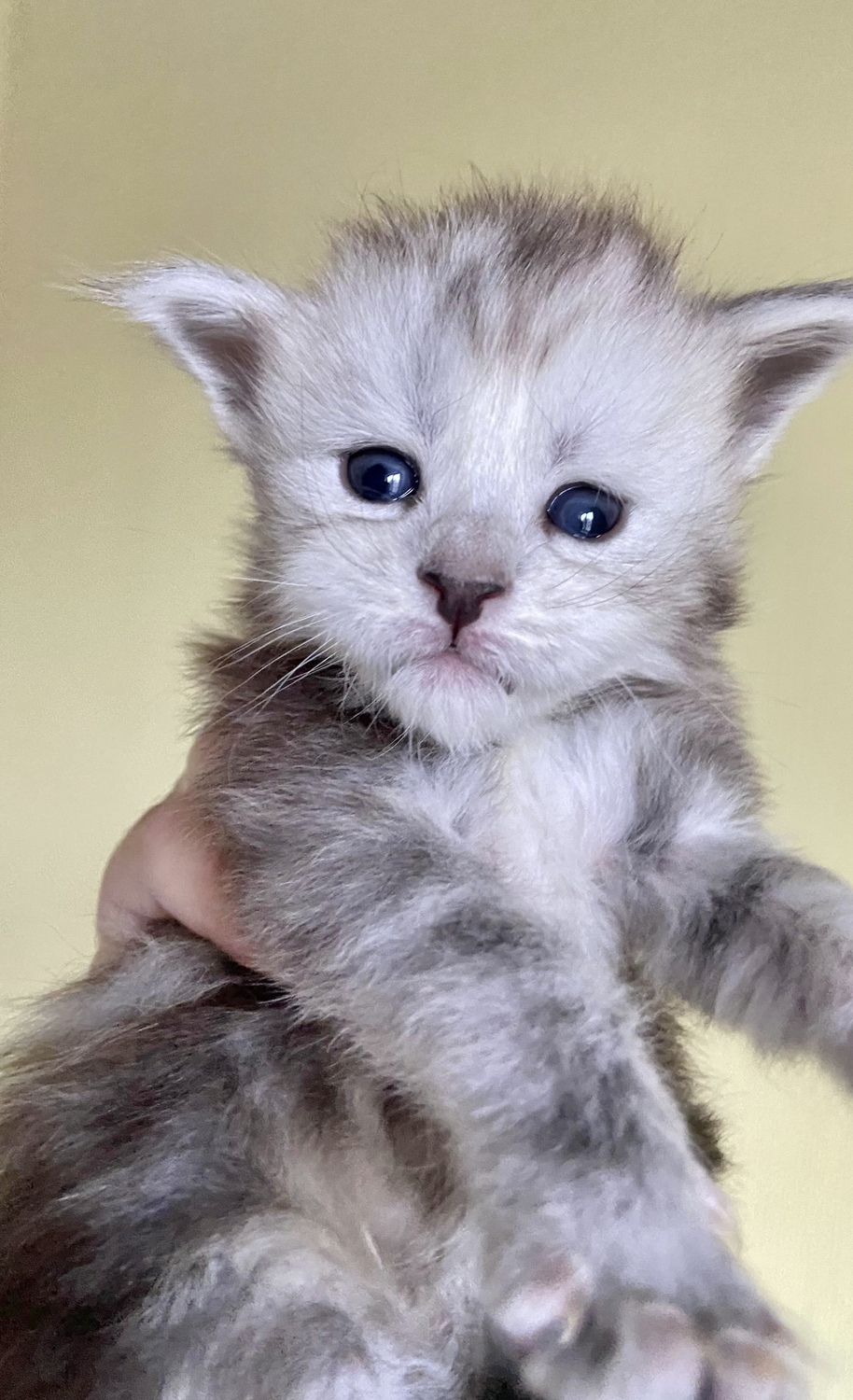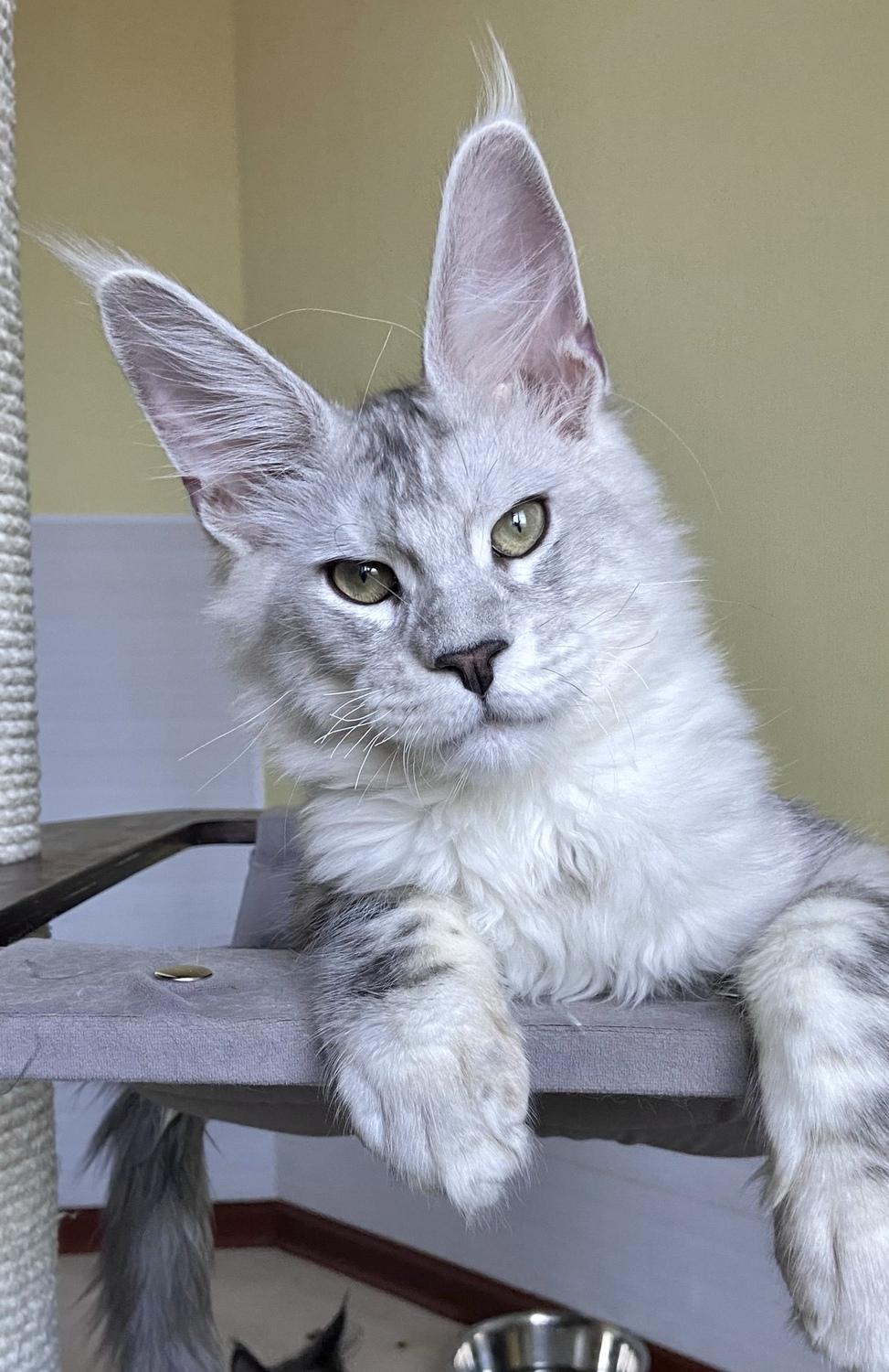 He has huge ears, a wide muzzle, a good profile and a very expressive look of the green eyes. He has a very good size, high on legs and with a long massive body with strong bones and excellent fur.