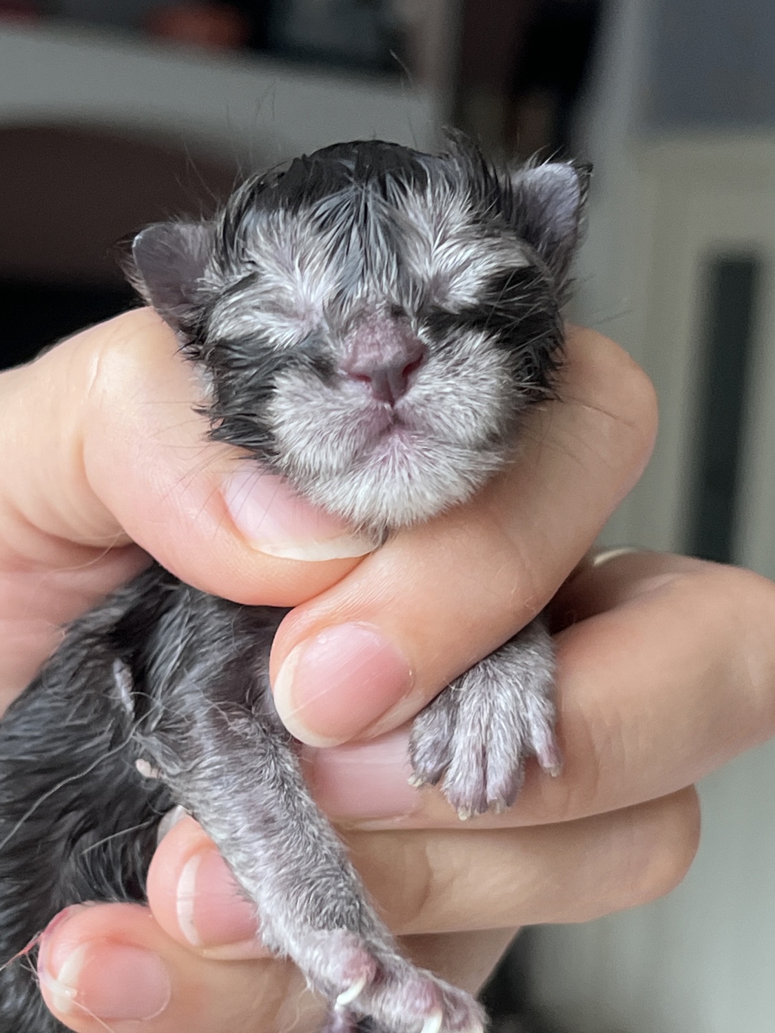 High ears, the tail that reaches her nose and super sweet temper from both the parents.