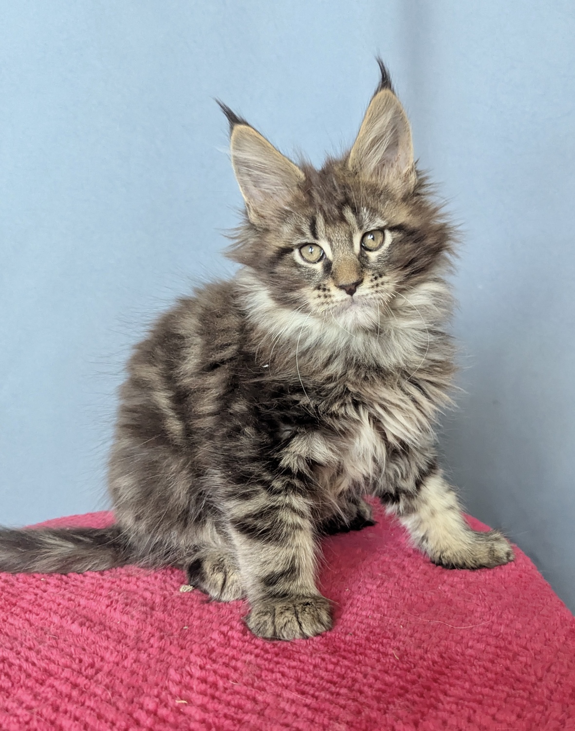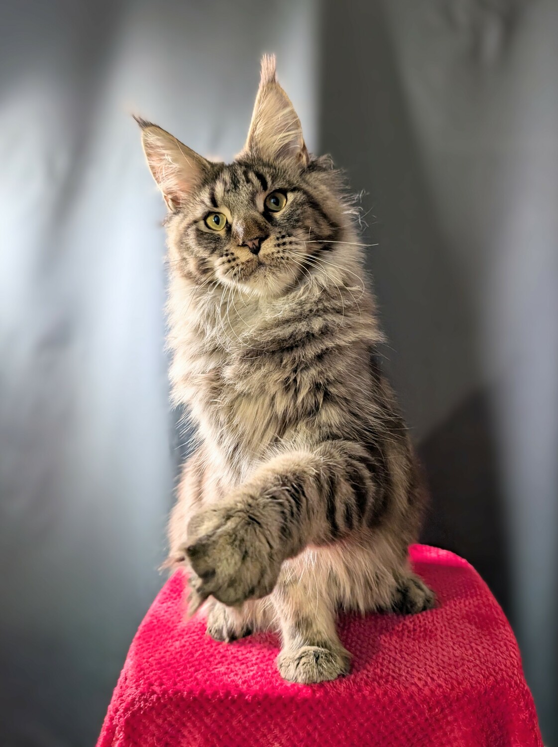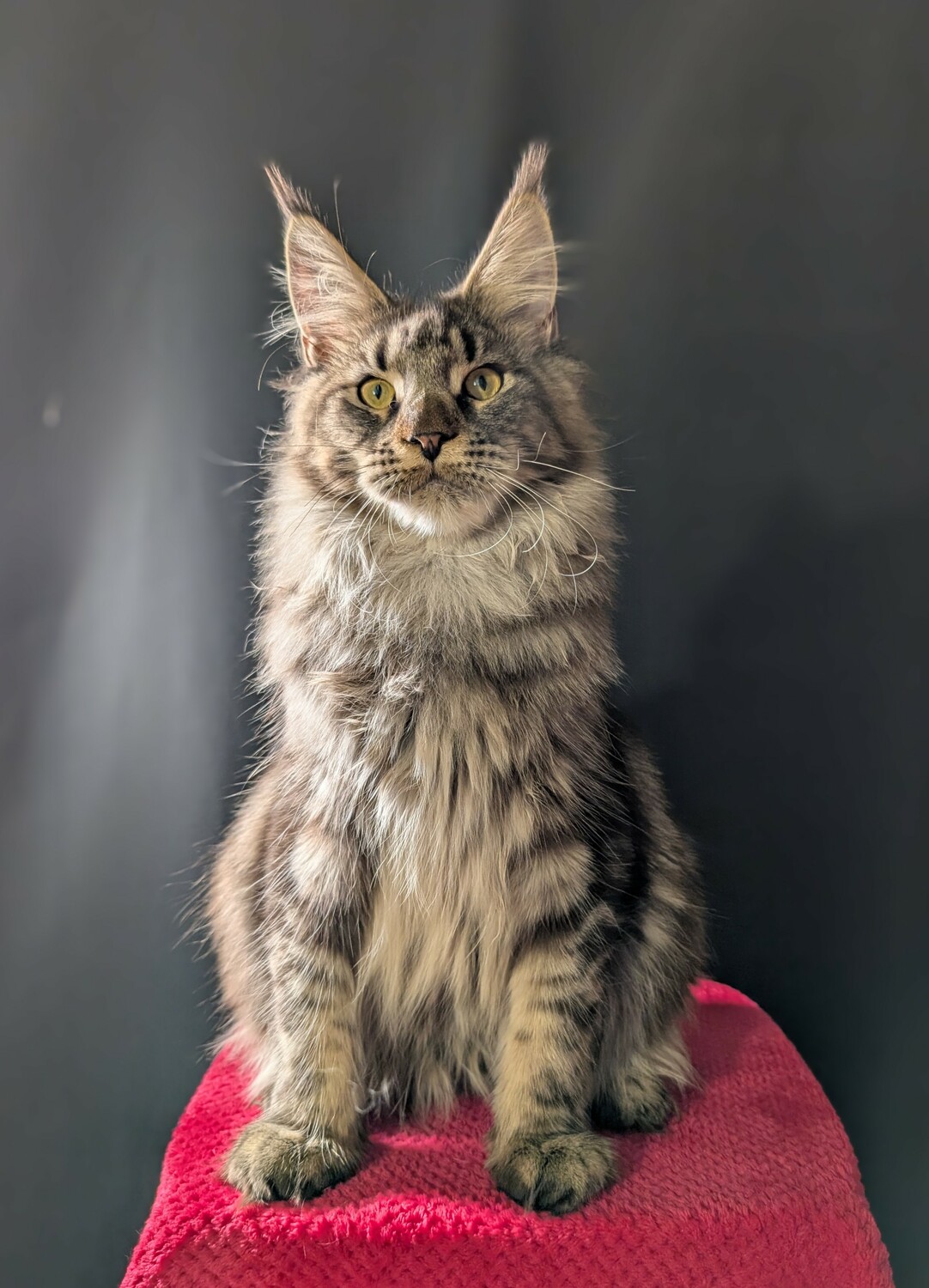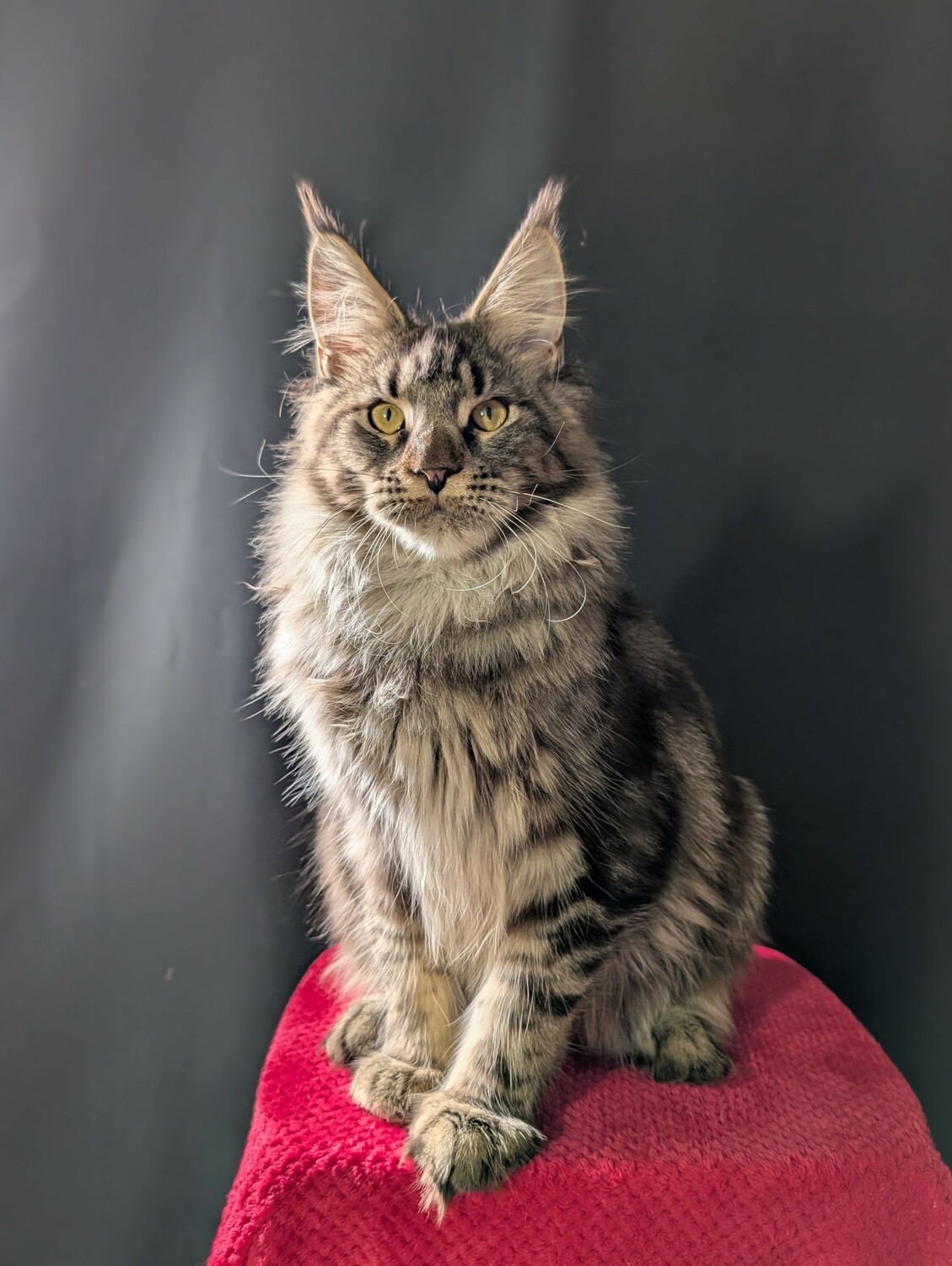 Олигарх - очень высокопородный парень с широкой мордой, сильным подбородком, харизматичным взглядом, мощным телосложением, выраженным классическим табби-рисунком, великолепной шерстью. Подходит для небольшого питомника или в качестве любимца.